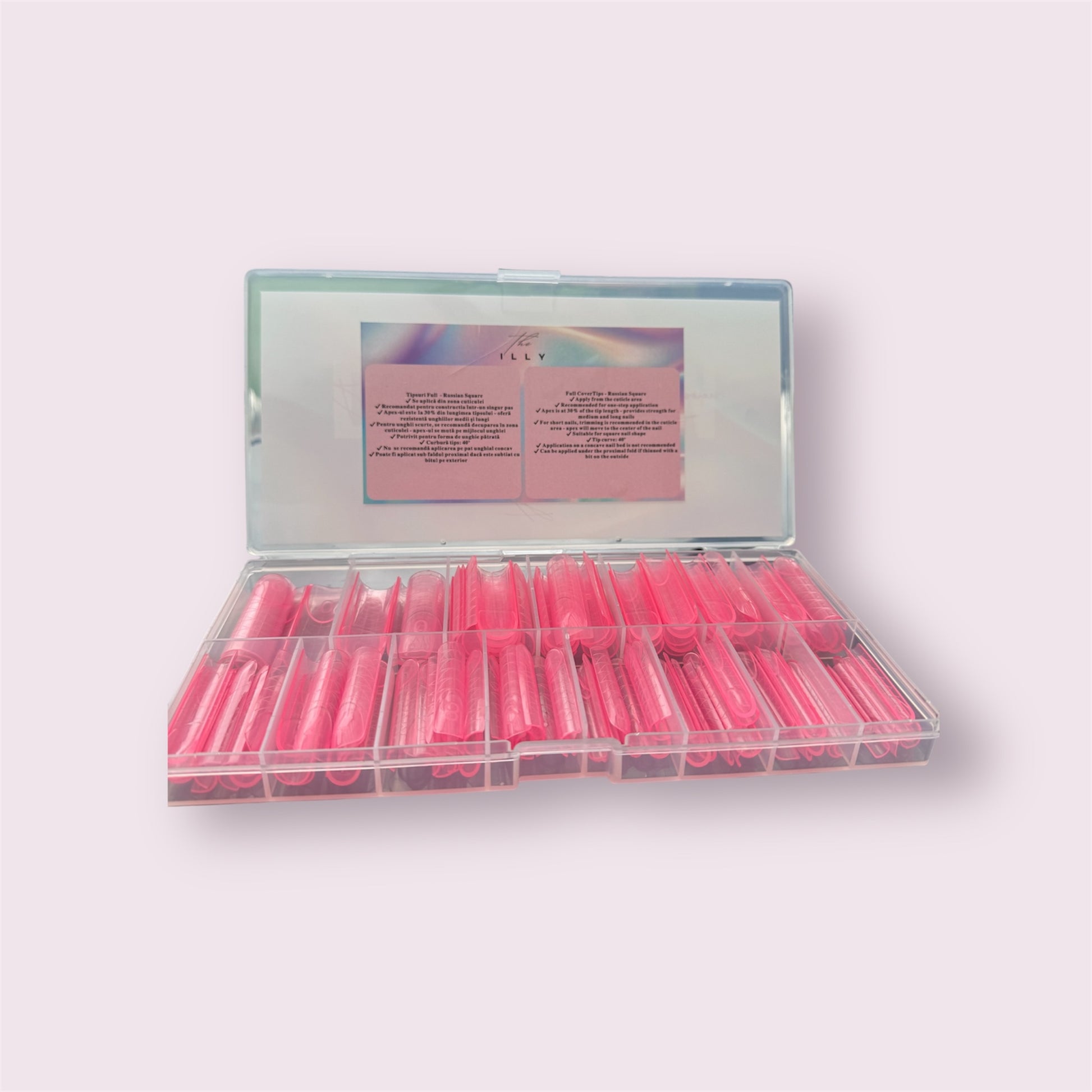 Obține extensii perfecte cu setul nostru profesional de Dual Form Russian Square de la the ILLY – ideal pentru tehnicienele care vor precizie, viteză și formă impecabilă. Fiecare cutie conține 140 de tipsuri reutilizabile, în 14 mărimi diferite, ambalate elegant într-o cutie transparentă cu design iridescent.